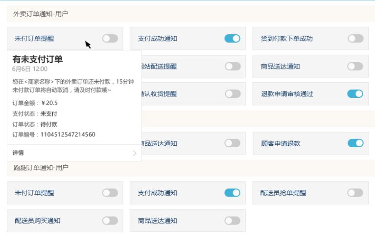 支持通知商家和用户,后台可以自定义开启或者关闭,绑定微信后可自动通知订单状态,商家可通过微信接收订单信息。